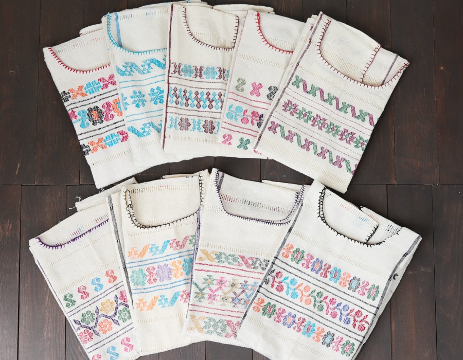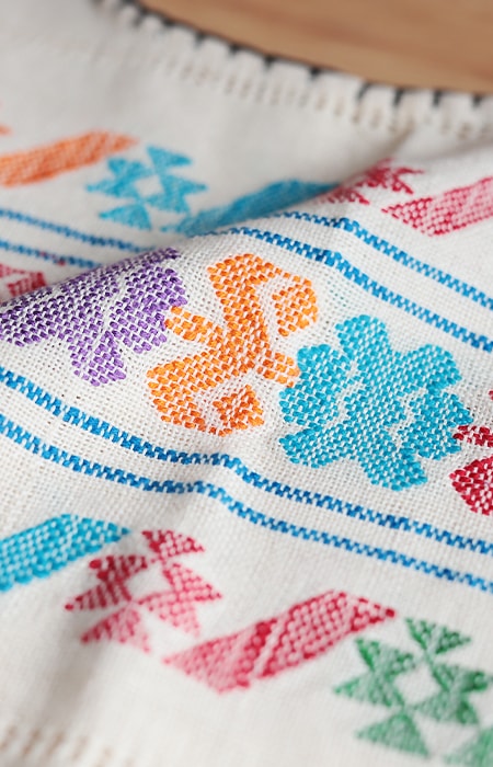 カラフルなお花や幾何学模様がかわいらしい、伝統的な織り手法。