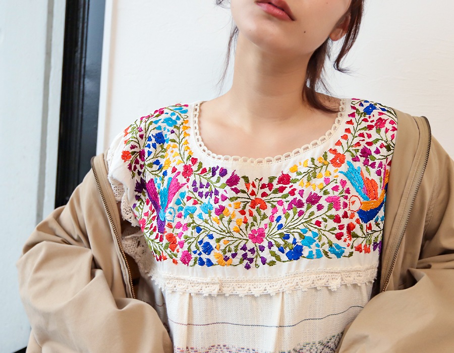 メキシコの伝統的な織りと刺繍が合わさった、目にも鮮やかなブラウス