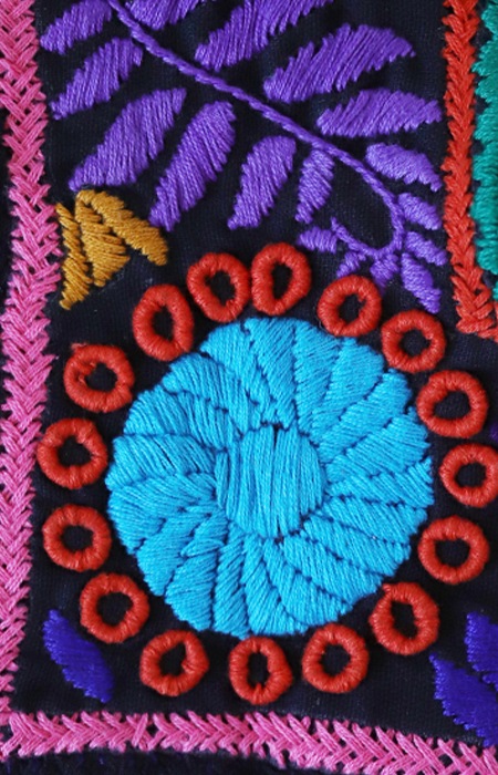 チアパス州の村々に伝わる刺繍は、「Rococo(ロココ)」と呼ばれる、糸の周りに糸を巻きつけて施されるぷっくり立体的なステッチが特徴。草花がモチーフとなっているデザインがほとんどで、主にお花の花びら部分にこの技法が用いられます。