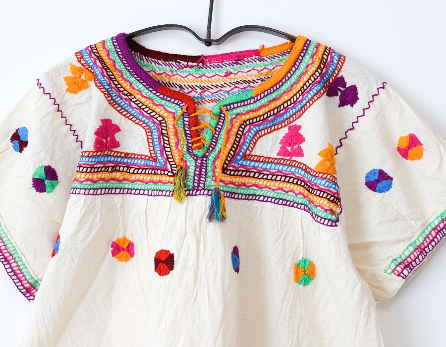 メキシコ・チアパス州の「サン・ファン・チャムラ村」で作られた、色とりどりの糸で縫われた刺繍が贅沢なチュニック。