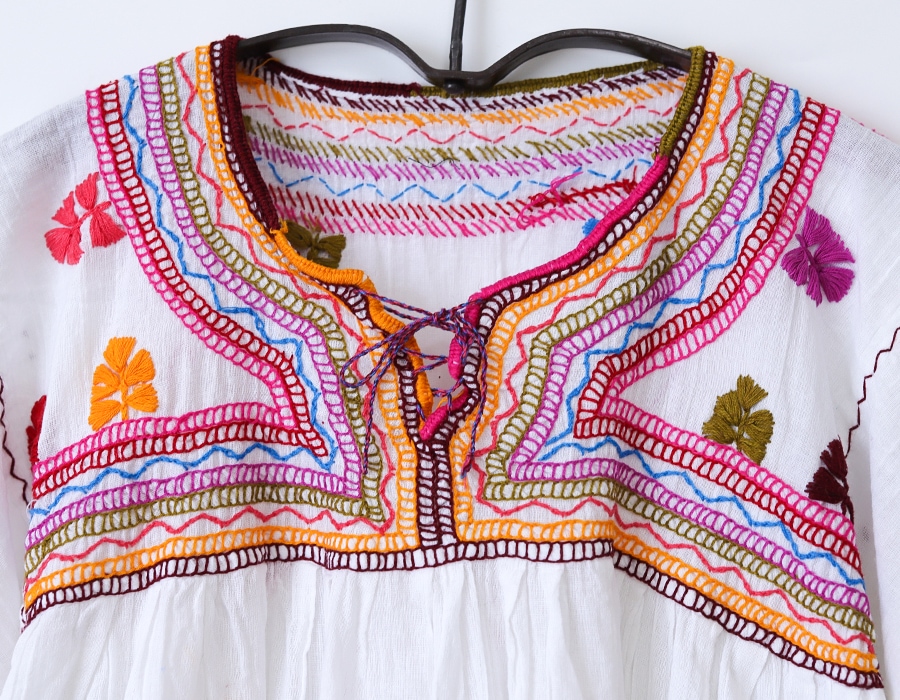 メキシコ・チアパス州の「サン・ファン・チャムラ村」で作られた、色とりどりの糸で縫われた刺繍が贅沢なチュニック。