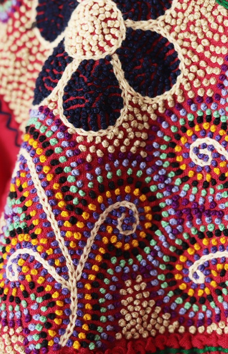 玉留めをたくさんしたようなステッチは「nuditos(小さな結び目)」と呼ばれる刺繍。どちらもとても時間のかかる刺繍で、職人さんの技術とそのカラフルな色使いに見惚れてしまいます*